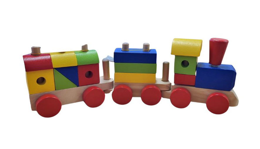 Classic wooden shape stacking train with electronic train sounds. Each train carriage features a set of wooden pegs that each shape slides over, allowing the pieces to be stacked and built-up on top of one another. Push down on the funnel and one of three authentic train sounds will play. It's a fantastic new spin on a classic toy.