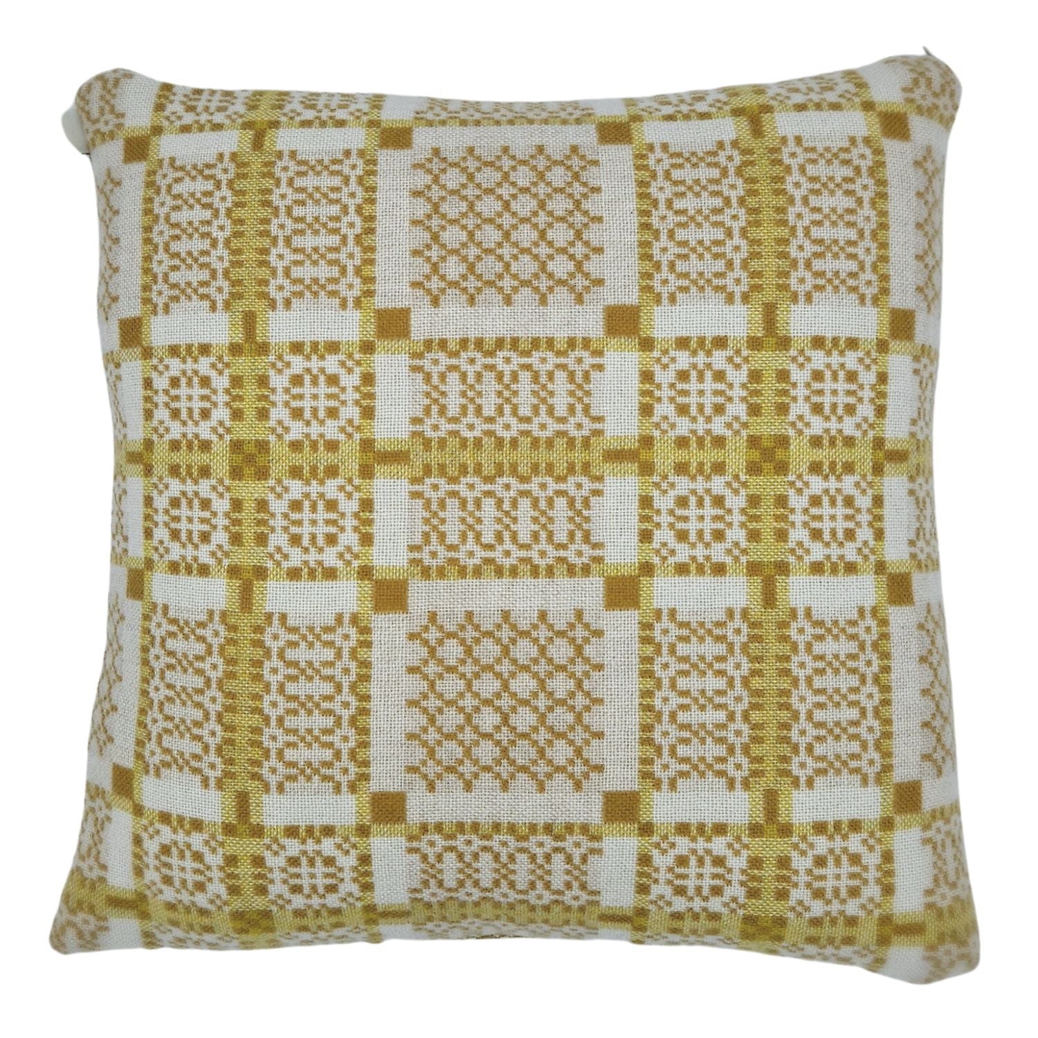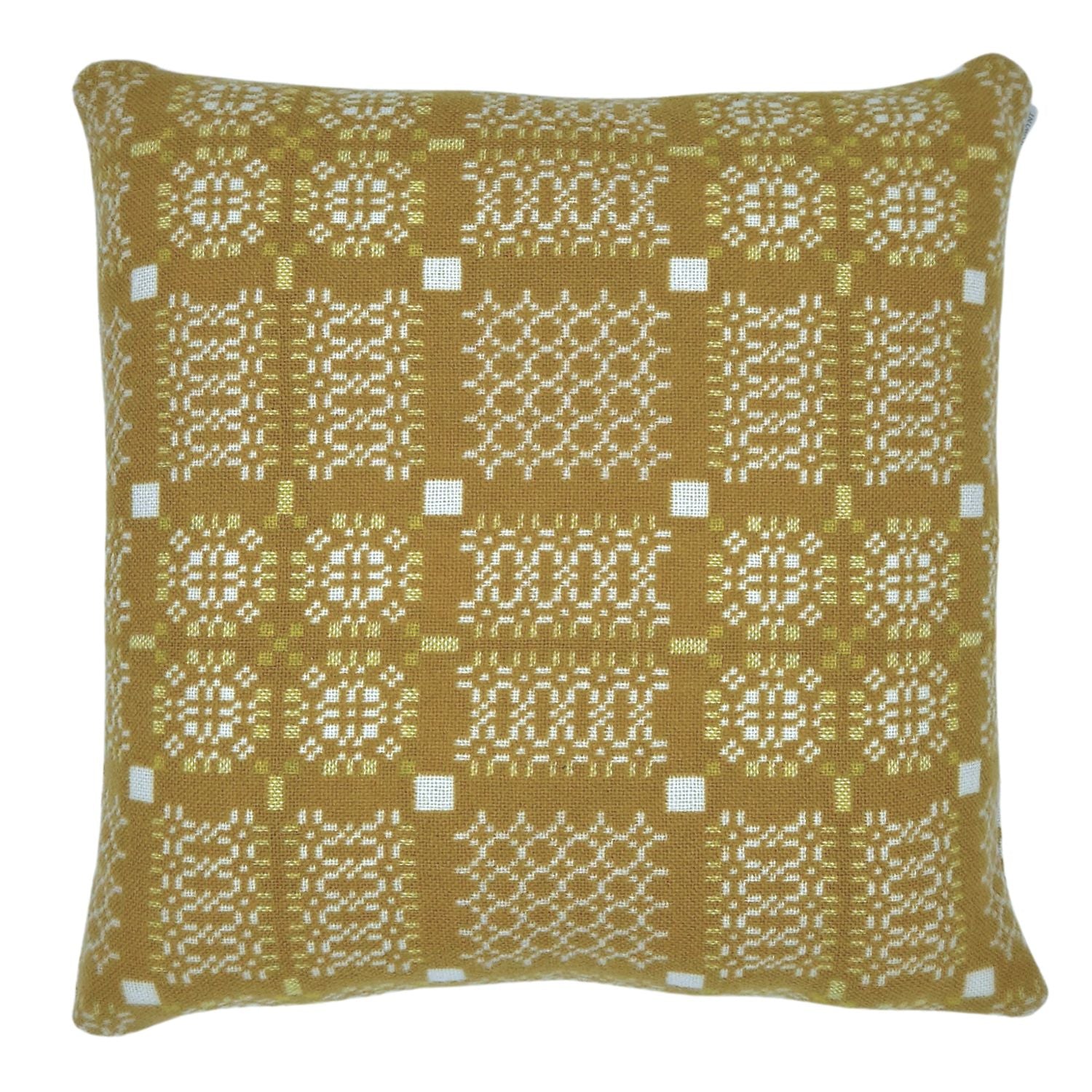 Clustog tapestri gwlân Cymraeg Melin Tregwynt, cyflenwir gyda phadiau plu.